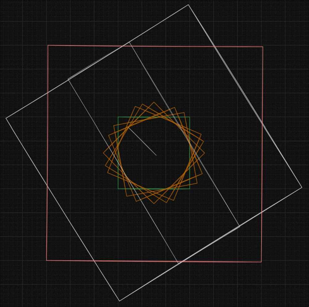 Eagle-eyed readers may notice that the Chocolate Bar doesn’t actually completely cover the all-important green square. In our video calls we’d rotate the green square with the mouse and it would appear as if the green square’s corners were like dolphins, constantly jumping out of and back into the Chocolate Bar. This led us to realise that the fundamental extent of the grid wasn’t actually a square, but a circle. You can begin to see this in the empty circular space caused by the many orange squares.