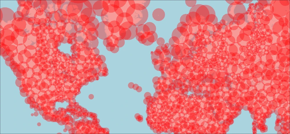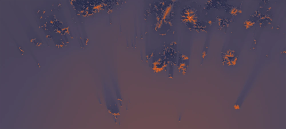 Firstly it outputs the longest line of sight found for every point. This is just a distance and an angle, which is enough to reconstruct the line on a map. So at the very least our app let’s you click anywhere on the planet and you’ll automatically be shown the longest line of sight at that point. But what if you want to get an overview of all the views in a particular region? You don’t want to be endlessly clicking on every point. Nor could we render all the lines at once, it would just be a noisy riot of slim triangles. This brings us to the other data our algorithm outputs.